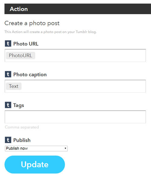 之后,在ifttt里创建一个Recipe,当新浪微博有新内容的时候,发布信息到Tumblr,Action内容如下: