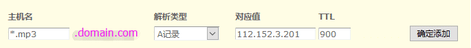 三级域名的泛解析:示例:*.mp3.domain.com做CNAME或者A记录解析到ip地址都可以。