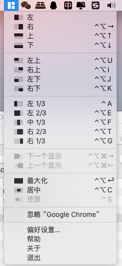 该软件提供了上下左右,左上角、右上角。左下角、右下角以及全屏,恢复之前窗口尺寸等多种窗口定位,但实际操作起来还是让我有些失望,因为有很多 App 都设计了最小窗口尺寸,当你需要设定“左上角、右上角。左下角、右下角”这组屏幕尺寸时,许多 App 的尺寸和位置都不会按设定来,这是比较让人遗憾的地方。