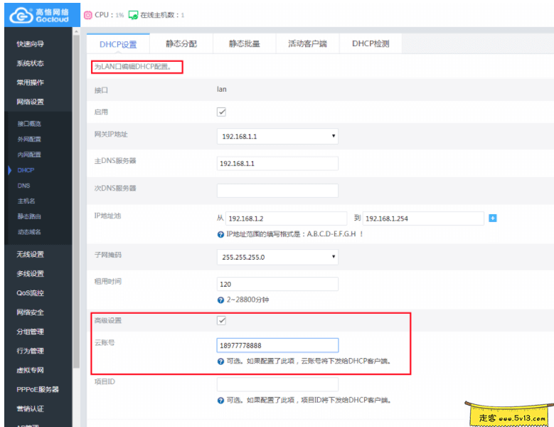 - 第一种情况,就像我的小伙伴的家中,新三做为高恪的主路由,那么本身就具备管理高恪ap的能力,我们将刷好的AP(k2和k2p)挂在预先准备好的高恪新三路由下面, 开启DHCP服务器, 并在DHCP高级选项里填入云账号和项目ID(可选, 如果不知道,一定要留空), 如下图所示, 如此可以自动下发云账号和项目ID到AP固件里,AP将自动加入到云端, 此时你就可以登陆高恪云(http://agent.gocloud.cn/),进入设备管理页面, 批量下发无线配置, 也可以在云端设备管理页面一键登陆AP管理界面。