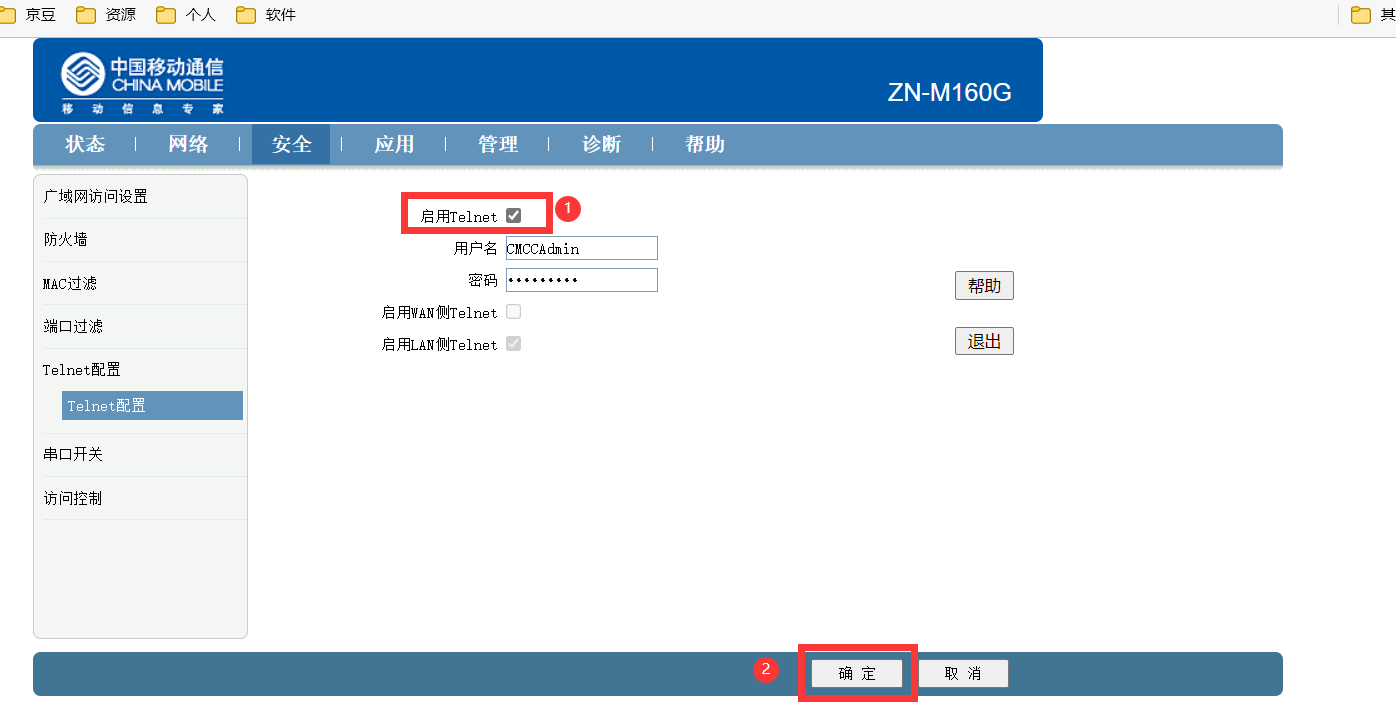 - 登录成功后访问一下网址http://192.168.1.1/getpage.gch?pid=1002&nextpage=tele_sec_tserver_t.gch然后会看到启用Telnet,我们勾选保存后重启。账号密码也许可以自行修改,我保持了默认,默认的Telnet账号为
