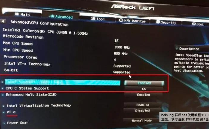 我的机器是J3455+8G内存+240GSSD,系统装了3615xs+6.17版引导的黑裙系统,局域网共享文件的读写性能不稳定,还非常慢,在论坛里看到别人方法就试了一下,结果是可行的,其实说起来简单,在BIOS里把Intel SPEEDSTEP和CPU C States这两项节能技术都关闭,设置后重启,实测文件读写速度很稳定基本都在110M左右,有的更高,该方法也能提高群晖的USB3.0端口的读写速度。