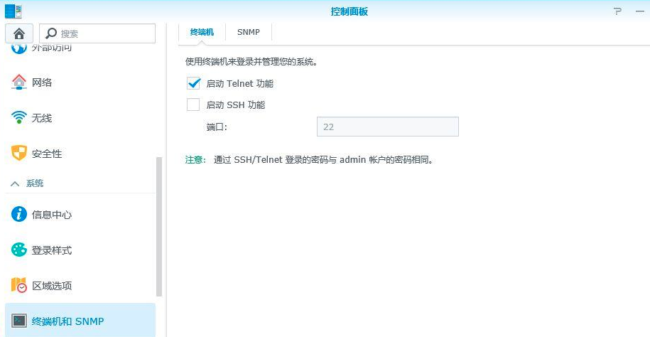 我们在 控制面板-终端机与SNMP,将启用Telnet功能勾选(开启SSH也是一样的,没有本质区别),然后点击应用,重启群晖一次。