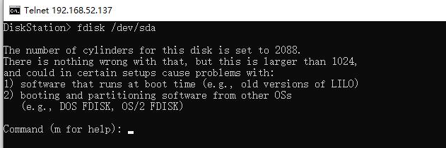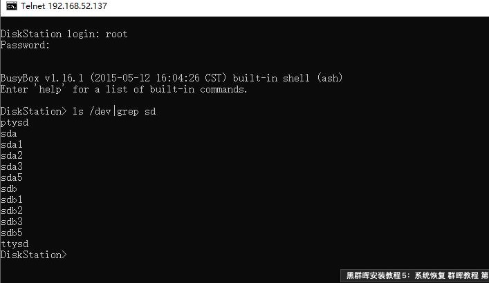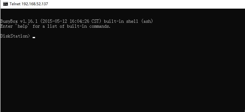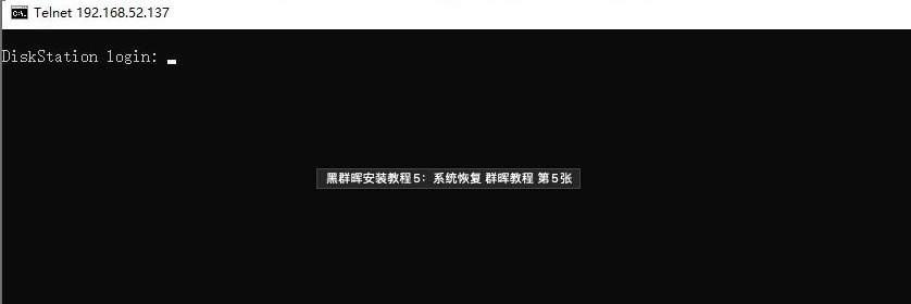 输入命令 telnet xx.xx.xx.xx ,这个xx.xx.xx.xx是你的群晖的局域网ip地址,我的是192.168.52.137.因此输入 telnet 192.168.52.137