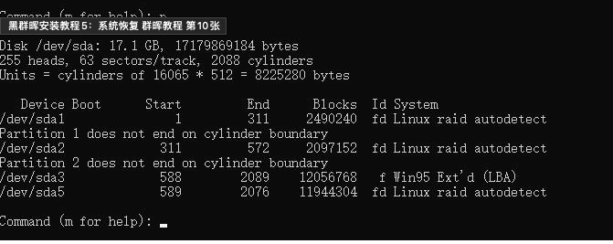 从输出可以看到,sda的大小为17GB是系统盘,输入“q”,然后回车退出fdisk。