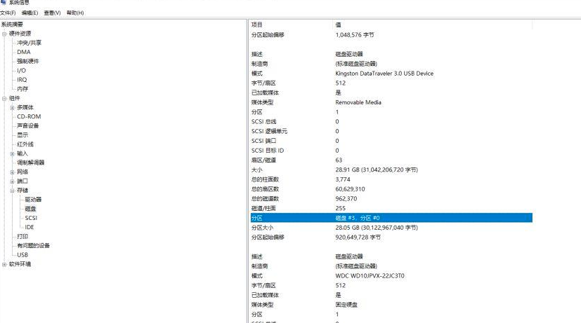 然后在运行里面输入 msinfo32,然后在左侧选择 组件,存储,磁盘。我这里利用一个U盘模拟,可以发现磁盘#3,记住这个数字
