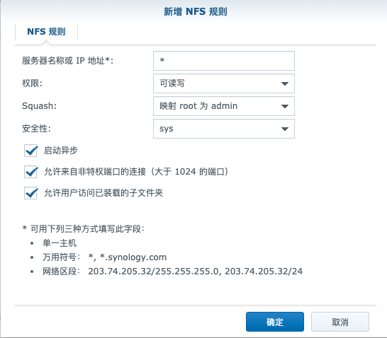 打开群晖NAS-控制面板-“共享文件夹”,点你要共享的文件夹,“编辑”-“NFS权限”-“新增”-“NFS规则”。服务器名称或IP地址填“*”,权限“可读写”,Squash“映射所有用户为admin”,安全性“sys”。勾选启动异步、允许来自非特权端口的连接、允许用户访问已装载的子文件夹,点两次确定按钮保存。
